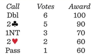 Meyers doubles for the third hand in a row. “If partner bids 2♦ , I will correct to 2♥, which should show longer clubs and four hearts.”