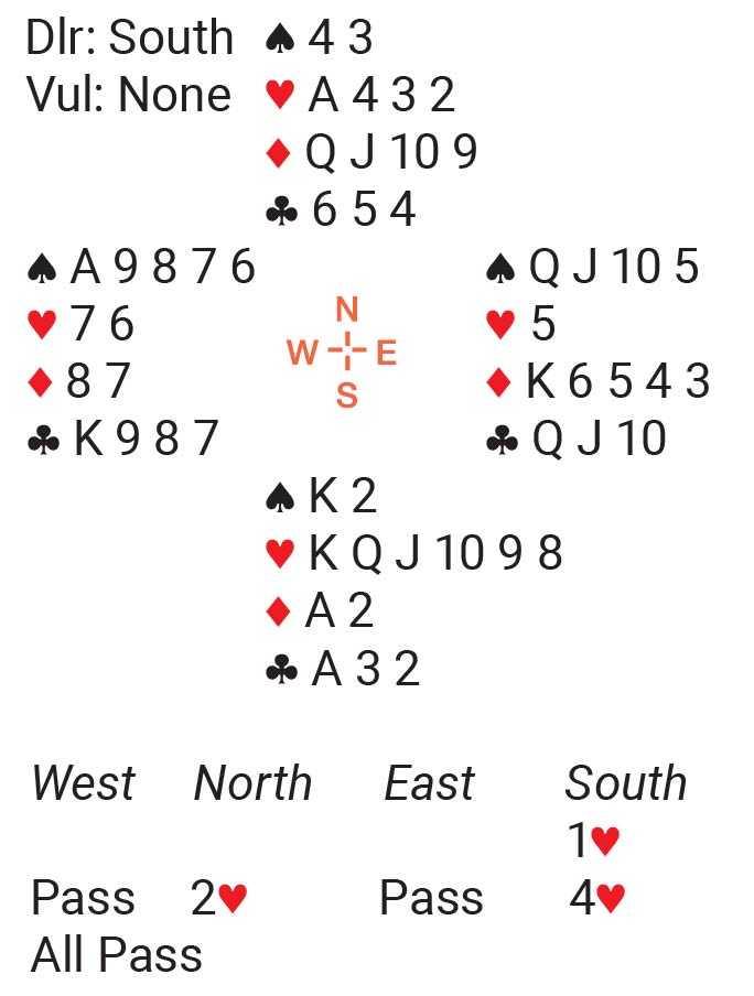 South, with extra values and a sixth trump, bids game after North’s single raise. The lead is the ♦8, covered with the queen. East plays the 3. As South, what’s your plan?