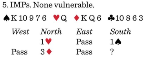 Sanborn bids 3♥, “unless I am playing that 3♦ promises five trumps, in which case I would raise. It is often right to take a false preference for the major. 4♥ is our most likely game. Should partner come to life, we canjump to 6♦ on the next round.”