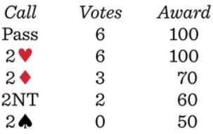 Karen Walker, the official scorer, was shocked at the number of passes. “I can’t believe anyone on the panel thinks partner’s pass shows a desire to defend, but I’ve been surprised before. If they’re just gambling/hoping for plus 200, my inclination would be to wait for 3♣ and turn it into 300.”