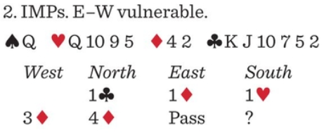 and with that, he’ll back off with 5♥ and we’ll be OK. But because East– West are vulnerable, it’s more likely partner has only one diamond and therefore: