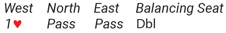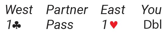 So far, we’ve reviewed Larry’s column on the basic takeout double, which promises 12–17 high-card points (HCP) and support for the unbid suits, and the “big double,” a hand with 18+ HCP. In both of those situations, the double was a “direct seat” action, meaning that the doubler’s right-hand opponent had opened the bidding: