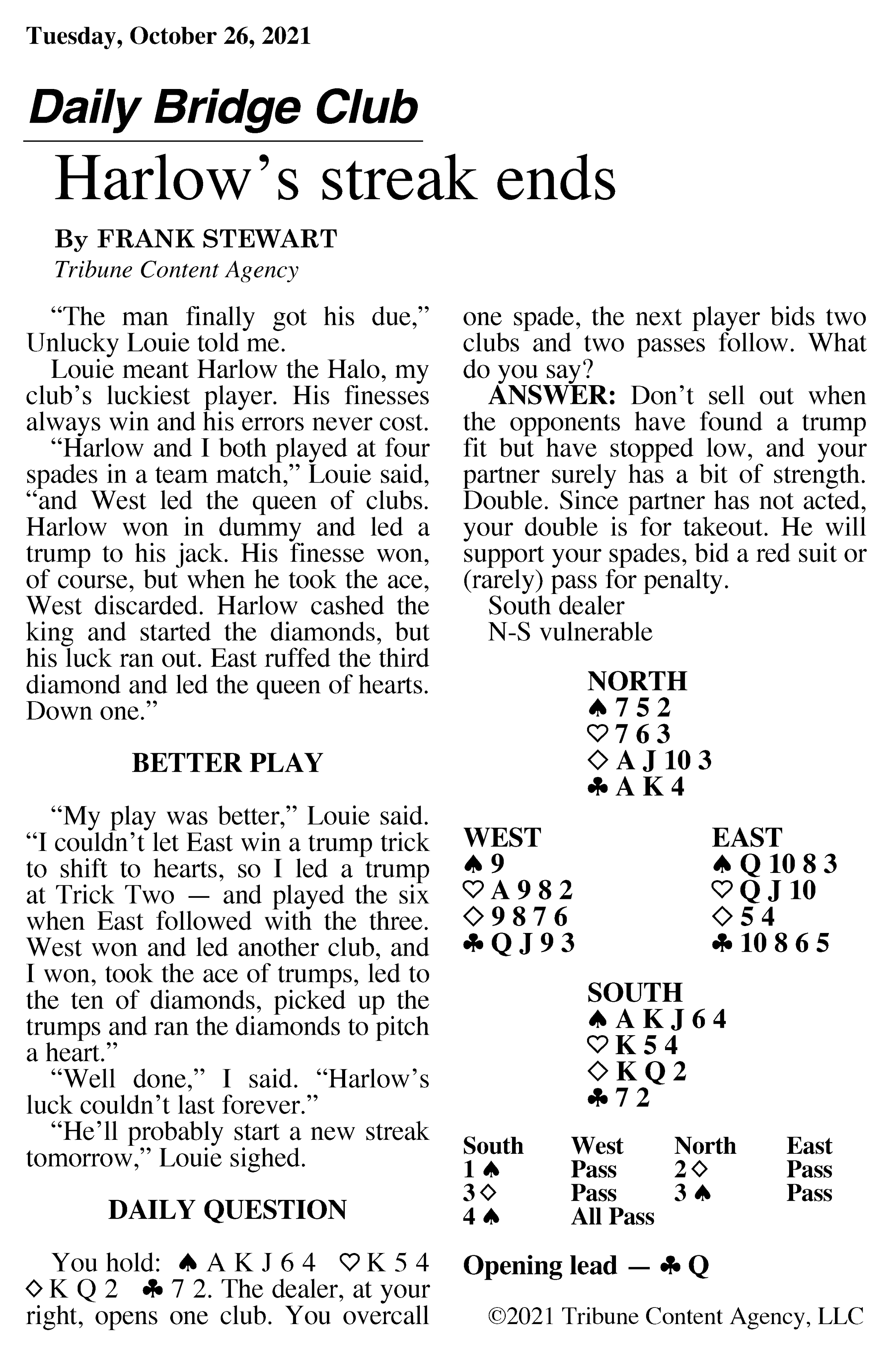 Frank Stewart’s column runs seven days a week and we don’t want you to miss any of them. To view Sunday’s column, click here. To view Monday’s column, click here.